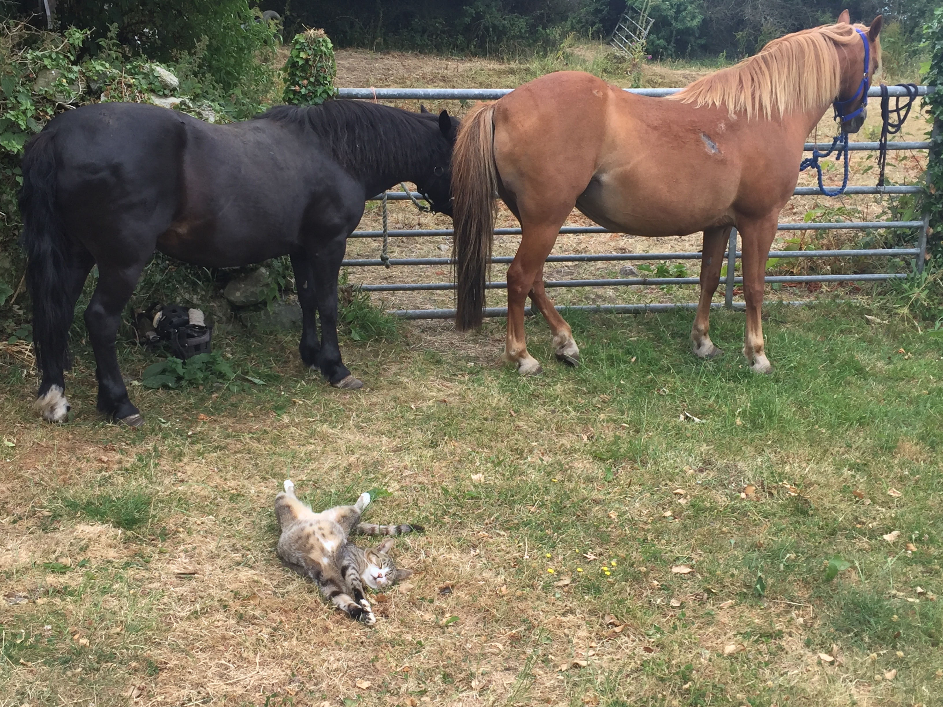 I'm the only cat here now but I'm quite happy surveying and monitoring the goings on. I love being round the horses. In the morning, when they are being fed, I sit doing my yoga exercises and ablutions, making sure my whiskers are in trim and my paws are snowy white. My food is put in a safe place everyday and I get plenty of strokes and tickles